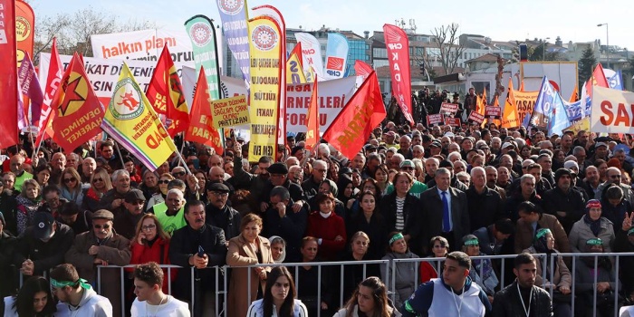 Buradan bir kez daha haykırıyoruz; zulme boyun eğmeyeceğiz, zalime biat etmeyeceğiz. Hak ve hakikat mücadelemizden, laik demokratik cumhuriyet idealimizden vazgeçmeyeceğiz. Cumhuriyetin birinci yüzyılında ötekileştirilmiş bütün halklar olarak bir araya gelip, omuz omuza mücadele edecek ve bu ülkeyi birlikte özgürleştireceğiz. Bugün bu meydanda bunu bir kez daha ilan ediyoruz. Kurtuluş yok tek başına, ya hep beraber ya hiçbirimiz. Er ya da geç ama mutlaka biz kazanacağız.” PİRHA/İSTANBUL