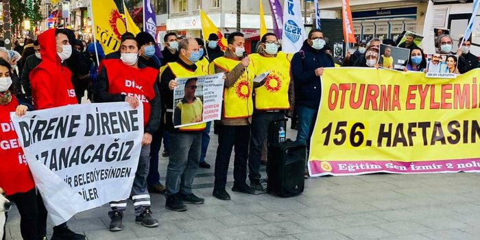 İzmir’de Kanun Hükmünde Kararname (KHK) ile işlerine son verilen kamu emekçilerinin, işlerine geri dönmek için başlattığı oturma eylemi, 156. haftasında devam etti. Karşıyaka Çarşı’da gerçekleşen eylemde konuşan Kamu Emekçileri Sendikaları Konfederasyonu’na (KESK) bağlı Eğitim Sen İzmir 2 Nolu Şube Başkanı Veysel Beyazadam, hakları için alanları terk etmeyeceklerinin mesajını verdi. OHAL İşlemleri İnceleme Komisyonunun ihraç edilen ve iki ay önce trafik kazasında yaşamını yitiren Mehmet Nasır Sönmez hakkında verdiği karara değinen Beyazadam, ”Arkadaşımızın göreve iade kararını açıklandı. Tekirdağ Çorlu’da yaşayan, ihraç edildikten sonra ciddi ekonomik zorluklar yaşayan arkadaşımız yaklaşık iki ay önce bir kaza sonucu yaşamını yitirdi. Üzgünüz, kızgınız. Geç gelen adalet, adalet değildir” diye konuştu.