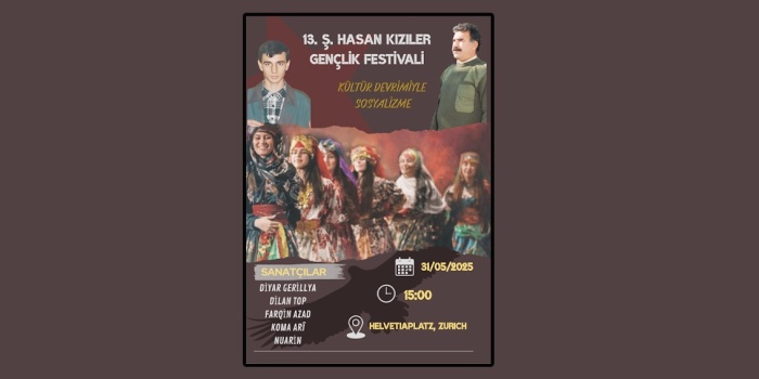 “Bi Şoreşa Çandî Ber Bi Sosyalizmê Ve” (Kültür Devrimiyle Sosyalizme) şiarıyla bu yıl 13’üncüsü düzenlenecek olan Hasan Kızıler Gençlik Festivali, 31 Mayıs’ta İsviçre’nin Zürih kentinde yapılacak.