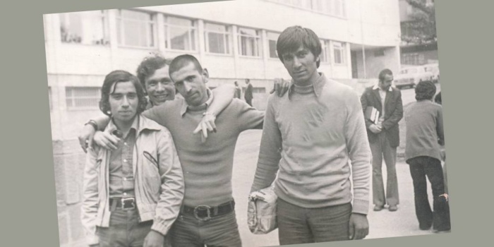 - “Bu fotoğraf, Siyasal Bilgiler Fakültesi Basın Yayın Yüksek Okulunun önünde çekildi. Hemen karşımızda birlikte kaldığımız Hukuk Öğrenci Yurdu var. En sağdaki Haki. Ben ortadayım; saçlarım kısa, cezaevinden yeni çıkmışım. Elim, Haki’nin omuzunda.”