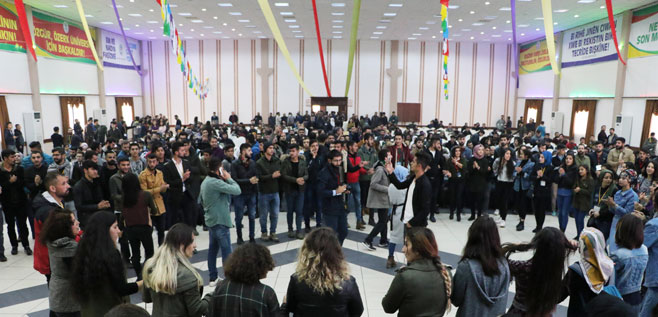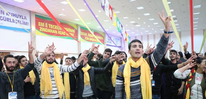 Kongre salonunun çevresinde polis ablukası dikkat çekerken, salona giren gençler aramalardan geçti. HDP’li gençlerin güvenlik kontrolünden sonra salona alımları başladı. Kongreye, Demokratik Toplum Kongresi (DTK) Eşbaşkanı Berdan Öztürk ve HDP milletvekillerinin yanı sıra Barış Anneleri, Sosyalist Gençlik Dernekleri Federasyonu (SGDF), Gençliğin Devrimci Güçleri (DEV-GÜÇ), Ezilenlerin Sosyalist Partisi (ESP) Gençlik Meclisi, Devrimci Parti ile Federe Kürdistan’dan Kürdistan Komünist Partisi Öğrenci Birliği, İran’dan ise Gençlik Birliği üyeleri katıldı. Salonu hınca hınç dolduran gençler, “Diren ha Diyarbekir” şarkısıyla coştu. Gençler sık sık PKK ve Öcalan lehine sloganlar atarken 25 Kasım Kadına Yönelik Şiddete Karşı Uluslararası Mücadele ve Dayanışma Günü dolayısıyla “Jin, jiyan, azadî” diye haykırdı. Slogan ve zılgıtların eksik olmadığı kongrenin başlamasının ardından Diyarbakır 5 No’lu Cezaevi’nde bedenini ateşe veren Mazlum Doğan, Zeynep Kınacı (Zilan) ve Gülnaz Karataş (Beritan) ile Ali Çiçek’in posterleri asıldı.
