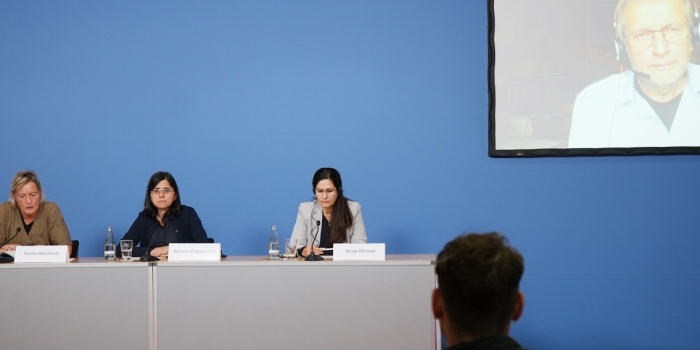 Merkezleri Almanya’da bulunan Uluslararası Hukuk ve Demokrasi Derneği (MAF-DAD) ve Kürdistanlı Akademisyenler Ağı (KURD-AKAD), Kobanî Tip Merkezi birlikte Berlin Federal Basın Konferansı’nda Federal Savcılığa yapılacak suç duyurusuna ilişkin açıklama yaptı. MAF-DAD Eşbaşkanı Heike Geisweid, KURD-AKAD Eşbaşkanı Dersim Dağdeviren, Kuzey ve Doğu Suriye Özerk Yönetimi Dış İlişkiler Temsilcisi İlham Ehmed, Yoksulluk ve Sağlık Derneği Başkanı Prof. Dr. Gerhard Trabert katıldı.