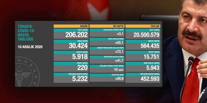 Türk Sağlık Bakanlığı’na göre bugüne kadar 1 milyon 748 bin 567 vaka tespit edilmiş durumda. TTB, Dünya Sağlık Örgütü’ne ise 872 bin 93 vakanın bildirildiğini açıkladı. Türk Sağlık Bakanı Fahrettin Koca, önceki akşam yaptığı açıklamada, korona salgınıyla ilgili devletin paylaşılmasını uygun gördüğü verileri aktardı. Buna göre; Türkiye ve Kuzey Kürdistan’da son 24 saatte 220 kişi daha hayatını kaybetti, 30 bin 424 yeni ‘vaka' tespit edildi. Böylece toplam vefat sayısı 15 bin 751’e, toplam hasta sayısı ise 564 bin 435’e yükseldi. Sağlık Bakanlığı, tabloya "toplam vaka" bölümünü de ekledi. Buna göre; bugüne kadar 1 milyon 748 bin 567 vaka tespit edilmiş durumda. Türk Tabipleri Birliği (TTB) ise verilerin Dünya Sağlık Örgütü’ne (WHO) farklı şekilde bildirildiğini açıkladı. TTB, “Sağlık Bakanı’nın bugün (10 Aralık), turkuaz tabloda açıkladığı toplam vaka sayısı 1 milyon 748 bin 567, Dünya Sağlık Örgütü’ne bildirdiği vaka sayısı 872 bin 93. 25 Kasım’dan bu yana açıklanan vaka sayısı 495 bin 850. Vakaların üçte ikisinin 8 aya, üçte birinin son birkaç haftada tespit edilmiş olması doğru olamaz” dedi.