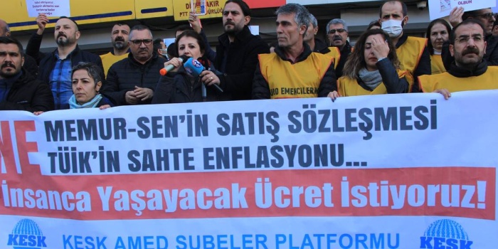 KESK Amed Şubeler Platformu, enflasyon oranını çarpıtmakla gündemde olan TÜİK'i protesto etmek için TÜİK Bölge Müdürlüğü önünde basın açıklaması yaptı. "Ne Memur-Sen'in satış sözleşmesi ne TÜİK'in sahte enflasyonu, insanca yaşayacak ücret istiyoruz" pankartının açıldığı açıklamada sık sık “Direne direne kazanacağız” sloganı atıldı. Burada konuşan Büro Emekçileri Sendikası (BES) Şube Yöneticisi Süleyman Öğüt, “TÜİK tarafından açıklanan rakamların, iktidarın yıllardır sürdürdüğü yaşanan gerçek enflasyonu perdeleme ve milyonlarca çalışanın maaşını düşük gösterme politikasıdır” dedi.