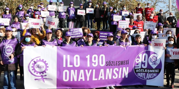 Devrimci İşçi Sendikaları Konfederasyonu (DİSK) Kadın Komisyonu, Uluslararası Çalışma Örgütü (ILO) 190 Sayılı İşyerinde Şiddet ve Tacizin Önlenmesi Sözleşmesi'nin onaylanması talebiyle 22 Kasım’dan bu yana bir kampanya başlattı. Kampanya kapsamında kent kent kampanyanın duyurusu yapılırken, işyerlerinde de farkındalık yaratmak adına bilgilendirme yapılıyor.