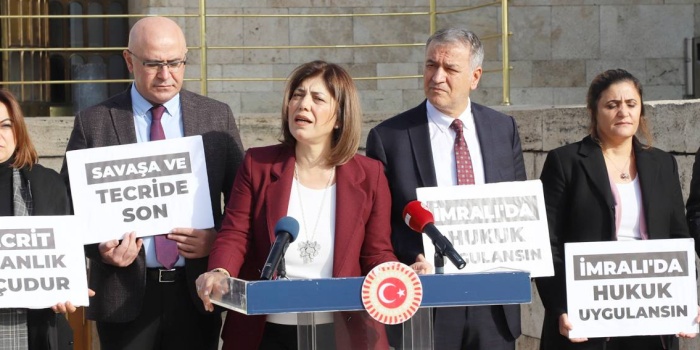 HDP Grup Başkanvekili Meral Danış Beştaş ile milletvekilleri Hişyar Özsoy, Mahmut Toğrul, Dilan Dirayet Taşdemir, Ömer Öcalan, Necdet İpekyüz, Gülistan Kılıç Koçyiğit, Hüseyin Kaçmaz, Zeynel Özen ve Kemal Peköz, dün “İmralı’da hukuk uygulansın” dövizleriyle Meclis bahçesinde açıklama yaptı.