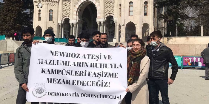 Demokratik Öğrenci Meclisi, Hacettepe Üniversitesi öğrencilerinin Beytepe Kampüsü’nde düzenledikleri Newroz kutlaması sonrası ırkçı bir grup tarafından saldırıya uğramasını İstanbul Üniversitesi önünde protesto etti. “Newroz ateşi ve Mazlumların ruhuyla kampüsleri faşizme mezar edeceğiz” pankartı açan gençler, açıklama yaptı.