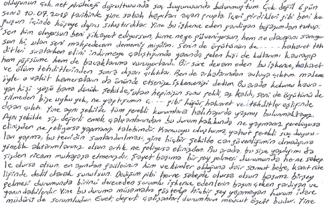 “İçeri girdikleri gibi beni koğuşun içinde köşeye sıkıştırdılar. Yine bu işkence eden gardiyan boğazımdan tutup, ‘Sen kim oluyorsun beni şikayet ediyorsun, kime güveniyorsun, hem ne olacağını sanıyorsun ki? Ulan seni mahvedecem dememiş miydim’ şeklinde hakaret ve tehditleri sıralarken elini indirmeye çalıştığımda yanında gelen kişi kollarımı kavrayıp hem göğsüme hem de bacaklarıma vuruyorlardı. Bir süre devam eden bu işkence, hakaret ve ölüm tehditlerinden sonra dışarı çıktılar. Ben de arkalarından avluya çıktım, ‘Madem öyle, o vakit kameraların önünde etsenize işkencenizi’ dedim. Bu arada kolumu kavrayan kişi; ‘Ulan hepinizin sonu geldi, az kaldı…’ gibi küfür, hakaret ve tehditler eşliğinde dışarı çıktı.”