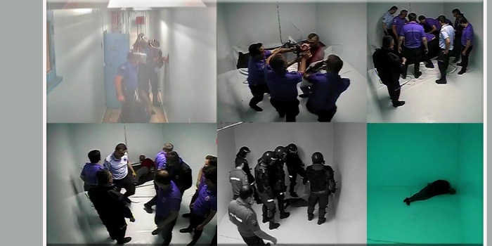 - Görüntülerde, gardiyanların Adsız'a tazyikli su sıktığı, kalkan ve coplarla saldırdığı, tekmelediği, ters kelepçeyle süngerli odaya atığı görülüyor.