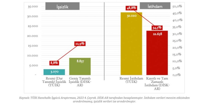 - Türkiye ve Kuzey Kurdistan'da çalışma çağındaki 65,6 milyon kişinin sadece 22,7 milyonu kayıtlı ve tam zamanlı işlerde çalışıyor. 2023'ün 4. çeyreğinde geniş tanımlı işsizlik oranı yüzde 23'ü buldu. Dar ve geniş tanımlı işsiz sayıları arasındaki fark 5,8 milyon oldu.