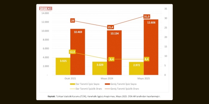 Mayıs 2024 ve Mayıs 2025 arası bir yıllık dönemde dar tanımlı işsizlik azalmış olarak açıklansa da geniş tanımlı işsizlikte ciddi artış yaşandı. Mayıs 2024’te yüzde 25,4 olan geniş tanımlı işsizlik oranı, son bir yılda 5,6 puan arttı. Mayıs 2024’te 10,1 milyon olan geniş tanımlı işsiz sayısı, Mayıs 2025’te 12,6 milyon oldu. Böylece geniş tanımlı işsiz sayısında bir yıllık artış 2 milyon 472 bin oldu.