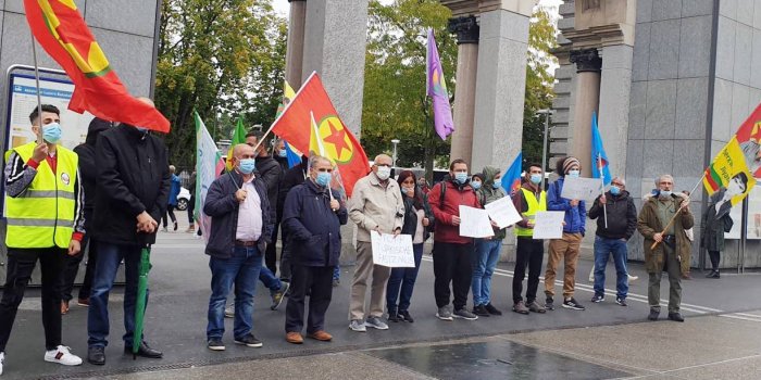 Kürdistanlılar AKP-MHP faşist iktidarının HDP'ye yönelik düzenlediği siyasi soykırım operasyonlarını protesto etti. "Birlik ve direnişle sömürgeciliği ve faşizmi yeneceğiz" pankartının açıldığı eylemde Türkçe, Kürtçe ve Fransızca konuşmalar yapıldı: “DAİŞ zihniyeti Kürt halkının onurlu direnişiyle nasıl bertaraf edildiyse DAİŞ'in devamı olan Erdoğan-AKP-MHP faşizmi de yenilmeye mahkum kalacaktır” denildi.