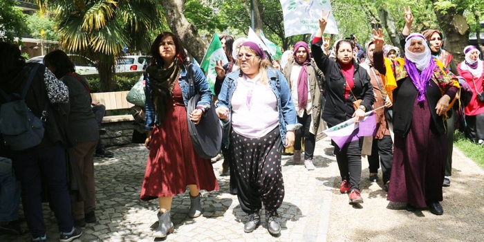 Çalınan Kürtçe stranlar ve seçim şarkılarıyla halay çeken kadınlar, Yoğurtçu Parkı’nda renklerini ve tercihlerini ortaya koydu. İktidarın kadın düşmanı ve eve hapseden politikalarına karşı buluşma alanında bir araya gelen kadınlar, bir an olsun taleplerini ve isyanlarını dile getirdiği sloganları dilinden düşürmedi. Alana yeni giriş yapan kadınlar da “Jin jiyan azadî”, “Bijî berxwedana zindanan” sloganıyla yürüdü.