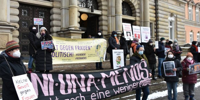 Eski eşi Kalender Erdoğan tarafından çocuklarının gözü önünde yakılarak öldürülmek istenen Meryem Şahin’le ilgili davaya dün Hamburg Eyalet Mahkemesi’nde devam edildi. Duruşma görülürken kadınlar da Meryem’le dayanışma için mahkeme önünde eylemdeydi. Hamburg Kadın Ağı tarafından düzenlenen eyleme Rojbin Kadın Meclisi, Hamburg ADKH, Sosyalist Kadınlar Birliği ve Hamburg ATIK-Yeni Kadın bileşenleri katıldı. Şahin davasında karar 5 Mayıs’ta açıklanacak. HAMBURG