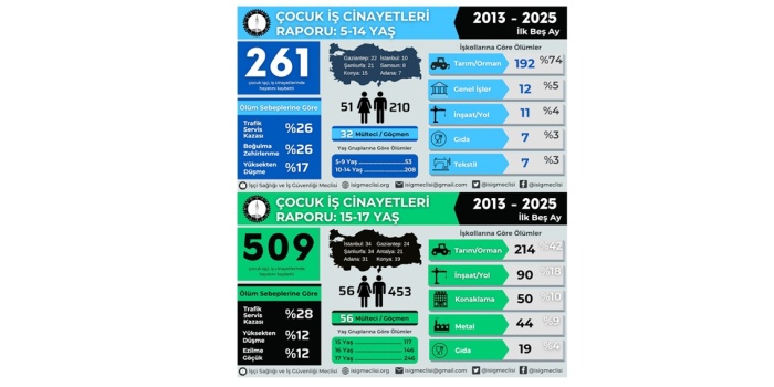 İşçi Sağlığı ve İş Güvenliği Meclisi (İSİG), 12 Haziran Dünya Çocuk İşçiliğiyle Mücadele Günü dolayısıyla “Çocuk İş Cinayetleri” raporunu açıkladı. Raporda, çocuk işçiliğinin derinleştiğine ve çocuk işçilerin sistematik olarak sömürüldüğüne dikkat çekilerek, son 12,5 yılda en az 770 çocuğun çalışırken hayatını kaybettiği belirtildi. Rapora göre; yaşamını yitirenlerin yüzde 34’ü 5-14 yaş, yüzde 66’sı ise 15-17 yaş aralığında bulunuyor. Özellikle 5-14 yaş grubundaki çocukların tamamına yakınının kayıt dışı çalıştırıldığı kaydedilirken, bu çocukların büyük bölümünün mevsimlik tarım işçisi olduğu ve sokakta ya da atölyelerde çalıştırıldığı belirtildi.
