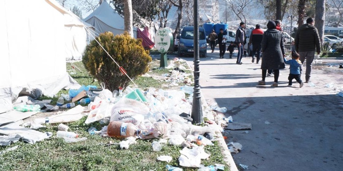Hatay stadyumu çevresinde kurulan çadır kentte yerleştirilen mültecilerin durumu ise içler acısı. Evleri yıkılan ve gidecek hiçbir yeri olmayan mülteciler bu çadır kampta çöplerin içinde yaşamak zorunda bırakılmış. Devlet desteğinin yetersiz olduğu, ilaç, gıda, su ve ısınma sorunun yaşandığı çadır kentte, yaşlı ve çocukların yalın ayak olduğu görülüyor. Çadır kentte karşılaştığımız İzmir’den gelen temizlik ekiplerine kentin çöp sorunu sorduğumuzda ise, “Kentte sadece 3 kişi çöpleri temizliyoruz. Tek bir çöp arabası var ve bu da çok yetersiz. Biz her yere yetişmekte zorlanıyoruz” yanıtını alıyoruz.