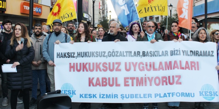 Kamu Emekçileri Sendikaları Konfederasyonu (KESK) İzmir Şubeler Platformu, önceki gün İzmir merkezli soruşturmada gözaltına alınan 30 KESK üyesi için Karşıyaka'da basın açıklaması gerçekleştirdi. Basın metnini okuyan KESK İzmir Şubeler Platformu Dönem Sözcüsü Deniz Çetin, siyasi iktidarın kendisi gibi düşünmeyen, sesini yükselten herkese gösterdiği tahammülsüzlüğün son dönemde arttığını söyledi. Toplumun tüm muhalif kesimlerinin hedefte olduğunu vurgulayan Deniz Çetin, "Emek ve demokrasi güçlerinin üzerindeki baskı oldukça açık. İzmir dahil 11 ilde aralarında üye ve yöneticilerimizin de bulunduğu yaklaşık 30 kişi gözaltına alınmıştır. Gözaltına alınan arkadaşlarımızdan İzmir’de yaşayan dört kişi dün gece serbest bırakılmıştır, diğerlerinin durumunun ise ne olacağı bilgisine henüz ulaşamadık. Kısıtlılık kararı nedeniyle üyelerimizin neden gözaltına alındığı dahi çok uzun süre öğrenemedik" ifadelerini kullandı.