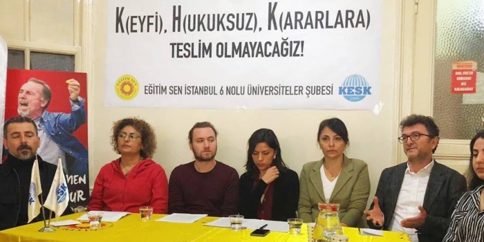Eğitim Sen 6 No’lu Üniversiteler Şube Başkanı Burak Çetiner ve Hülya Dinçer’in okuduğu açıklamada öne çıkanlar şöyle: “Eğitim Sen İstanbul Üniversiteler Şubesi üyesi 62 üniversite emekçisi, hukuksuz OHAL KHK’larıyla görevinden edilmiş; üyelerimizden 32’si için göreve iade, 30’ü için ise ret kararı verilmiştir. Her ne kadar bu süreçte mahkeme kararıyla görevine iade edilenler olsa da üniversite emekçilerine yönelik ihlaller katlanarak devam etmektedir. Üniversiteler tümüyle keyfi biçimde, hukuku çiğneyerek mahkeme kararlarını uygulamayı reddetmekte; göreve iade kararları bir üst mahkeme olan bölge idare mahkemelerinin çelişkili kararlarıyla bozulmaktadır. Bir kez daha hatırlatmak isteriz ki, bilim insanlarına devlete ya da siyasi iktidara sadakat veya biat yükümlülüğü biçmek, bilimsel ve akademik özgürlüğün özüne aykırıdır. Eğitim Sen olarak, haksız ve hukuka aykırı kararlarla ihraç edilen tüm üyelerimiz görevlerine iade edilene dek tüm gücümüzle mücadele etmeyi sürdüreceğiz." İSTANBUL
