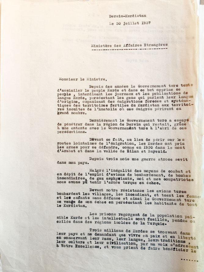 Yani Seyîd Rıza’nın mektubu, 30 Temmuz 1937 yılında Fransa’nın İstanbul Büyükelçiliği’ne teslim edilmiş. Belge bu tarihte, İstanbul’daki Fransız Büyükelçiliği’nden, Fransa Dışilişkiler Bakanlığı’na gönderilmiş. Gönderilme tarihi ile birlikte zarfın üstünde şu yazılıyor: “Kürdistan’ın Dersim Bölgesi’nden 30 Temmuz tarihinde gelen mektup” ve “Kürdistan’daki ayaklanma.”