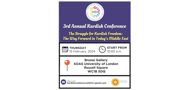 Britanya Kürt Halk Meclisi, “Öcalan’a Özgürlük, Kürt Sorununa Siyasi Çözüm” hamlesi kapsamında Londra’da SOAS Üniversitesinde 15 Şubat günü organize edilecek 3. Kürt Konferansı’na çağrıda bulundu.