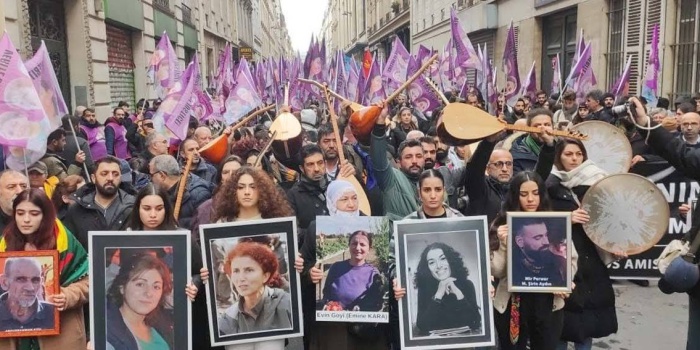 Yüzlerce kişi dün Evîn Goyî (Emine Kara), Mîr Perwer (Mehmet Şirin Aydın) ve Abdurrahman Kızıl’ın 23 Aralık’ta katledildiği Ahmet Kaya Kürt Kültür Merkezi’nden Sakine Cansız (Sara), Fidan Doğan ve Leyla Şaylemez’in 9 Ocak’ta katledildiği Kürdistan Enformasyon Merkezi’ne yürüdü. İki Paris katliamında şehit düşenlerin fotoğraflarının taşındığı yürüyüşte, katliamda yaşamını yitirenlerin yakınları “İntikamımız kadın devrimiyle olacak“pankartı ardında yürüdü. Katledilen sanatçı Mîr Perwer’in yoldaşları TEV-ÇAND sanatçıları ise enstrümanlarıyla yürüyüşte yerini aldı. Yürüyüş boyunca Mîr Perwer’in şarkıları ve konuşmaları da dinletildi.