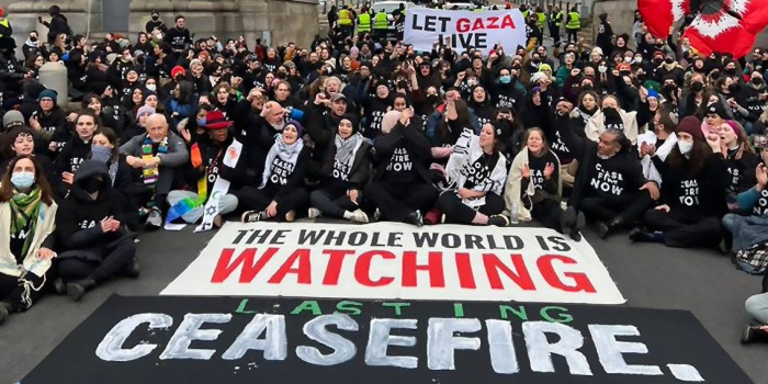 - Irksal ve Ekonomik Adalet için Yahudiler (JFREJ) Demokrasi ve Sosyalizm için Yazışma Komiteleri ( CCDS ) ve Jewish Voice for Peace’in öncülüğünde New York’daki Manhattan köprüsünü ulaşıma kapatan aktivistler kalıcı ateşkes ve rehinelerin serbest bırakılmasını istedi.