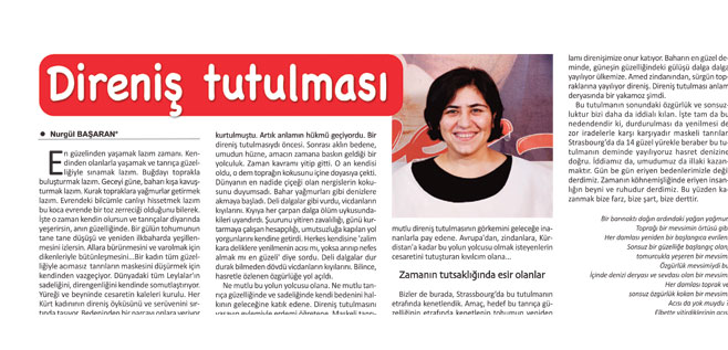 Gazetenin Nisan Sayısı’nda yer alan isimlerden biri de açlık grevi eyleminin 108’inci gününde olan Nurgül Başaran. Direnişçi, kaleme aldığı satırlarla binlerce eylemcinin yüreğinin ve taleplerinin tercümanı oluyor: “Ne mutlu bu yolun yolcusu olana. Ne mutlu direniş tutulmasını yaşayıp eylemiyle erdemi öğretene. Maskeli tanrılara karşı bedenini ve beynini kuşanıp yola koyulana. Bir ada sevdalısı olduğunu ilan edene…”