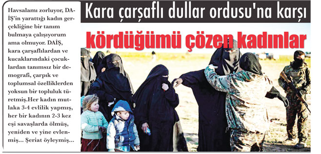 Rojava’da DAİŞ çete örgütünün bitişine tanıklık eden gazeteci Medya Doz ise bu karanlık örgütün yarattığı kadın gerçekliğini ve çarpık sosyolojisini yazdı. DAIŞ’ın kadınları ve toprakları işgal ederek toplumsal kimya bozukluğuna yol açtığını ifade eden Doz, “DAİŞ, kara çarşaflılardan ve kucaklarındaki çocuklardan tanımsız bir demografi, çarpık ve toplumsal özelliklerden yoksun bir topluluk türetmiş” sözleriyle durumu özetliyor.