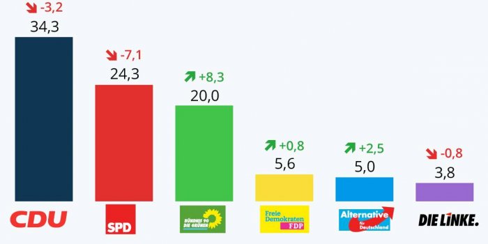 Aşırı sağcı AfD ise yüzde 3 bandındaki oyunu yüzde 5’e çıkardı. Hür Demokratlar’ın (FDP) yüzde 5,6 oy aldığı seçimlerde, Sol Parti ise yüzde 4’ün altına düştü. Die Linke’nin (Sol Parti) oy oranı yüzde 3,8 oldu.