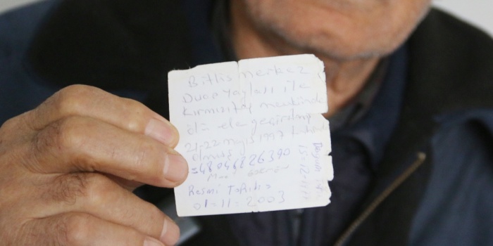 Bitlis Jandarma Merkez Karakolu'na gittim. Orada bir komutan vardı. Oğlumun öldüğünü ama bana cenazeyi vermediklerini anlattım. Bir not defteri çıkardı. Bana oğlumun isminin Murat olup olmadığını sordu. Ben de 'Evet oğlumun adı Murat' dedim. Bana bir pusula yazdı. İşte üzerinde oğlumun kimlik bilgileri yazılıydı. Oğlumun nerede öldüğünü ve savcının onu nerede gömdüğünü yazdı. Dosyayı Wan'a gönderdiklerini söyledi.