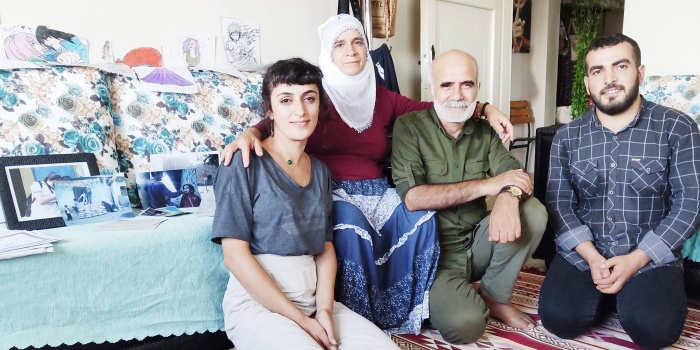 “Öldürülmeselerdi Arkadaşlarımız Olacaklardı” kitabını hazırlayan Yasemin Soydan ve Mezdan Nakçi, Sur’da 17 yaşında katledilen Rozerin’in annesi Fahriye ve babası Mustafa Çukur ile birlikte.