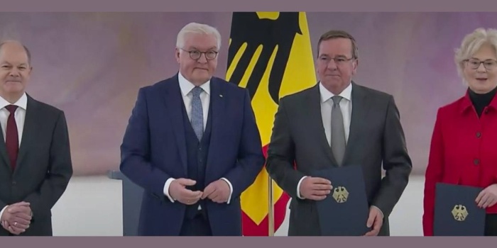 Pistorius Perşembe sabahı önce Cumhurbaşkanı Frank-Walter Steinmeier'den mazbatasını aldı. Bellevue Sarayı'nda düzenlenen törene Sosyal Demokrat Partili (SPD) Başbakan Olaf Scholz da katıldı. Pistorius'a yeni görevinde "Direnme gücü, başarı ve şans" dileyen Cumhurbaşkanı Steinmeier, yeni Savunma Bakanı'nın Ukrayna Savaşı nedeniyle "soğuk kanlılığa, güçlü sinirlere, liderliğe, açık ve net bir dile ve siyasi tecrübeye" ihtiyacı olduğunu vurguladı.