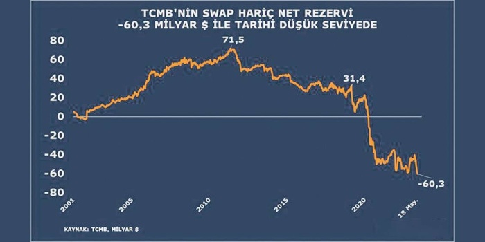 Swap dahil net rezervi geçen hafta 2,5 milyar dolarlık düşüşle -0,2 milyar dolara geriledi. Böylece bu kalemde 21 yıl sonra ilk kez eksiye düşülmüş oldu.