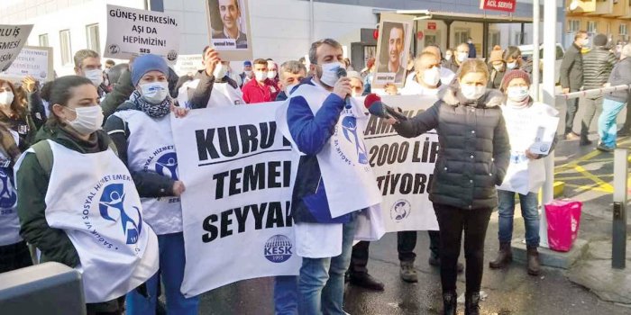 Sağlık ve Sosyal Hizmet Emekçileri Sendikası (SES) Aksaray Şubesi, ek ödemeler ve toplu iş sözleşmesine dikkat çekmek amacıyla basın açıklaması yaptı. Cerrahpaşa Tıp Fakültesi önünde gerçekleşen açıklamaya çok sayıda sağlık emekçisi katıldı. SES Aksaray Şubesi İşyeri Temsilcisi Aydın Erol, sağlık ve sosyal hizmet emekçilerinin zor koşullarda çalıştığını belirterek, salgının şartları daha da ağırlaştırdığını söyledi. Erol, ”Yurttaşlarımız, çalışma arkadaşlarımız hastalanıp ölürken biz ekonomik taleplerle gündeme gelmekten imtina ettikçe, iğneden ipliğe yapılan zamlar, zaten yoksul olan biz sağlık emekçilerini eylem yapmaya zorluyor. Temel gıda ürünlerinden geçmediğimiz köprülerin ücretlerine, vergi ve harçlardan elektriğe kadar zamlar yağmur gibi yağdırılıyor. Görünen o ki yandaş şirketler için boşaltılan kasa, yeniden emekçilerin alın teriyle dolana kadar zam yağmurları devam edecek” dedi.