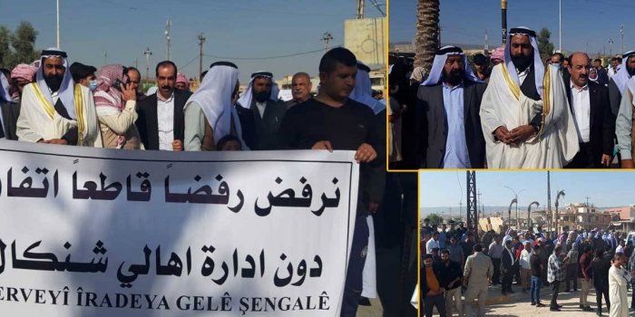 Şengal halkı, dün iradelerini hiçe sayan bu anlaşmaya karşı yürüdü. Şengal merkezinde başlayan yürüyüş, Qibayil Kavşağı’nda tamamlandı. Burada yapılan açıklamada, ”Tüm Êzîdîlerin dönüşü, Şengal’in yeniden imarı ve sorunların çözümü bizim de istemimizdir. Şengal’in halkı, iradesi, mağdurları ve kurtuluşu için fedakarlık yapanları dikkat almayan anlaşmayı, kim yaparsa yapsın karşı çıkıyoruz. Şengal halkı olarak şunları altını çiziyoruz: ”Kent yönetimi hakkında alanacak tüm kararlarda Şengal halkı da yer almalı. Şengal hakkındaki kararlara halkın katılımı için bir kurul/mekanizma oluşturulmalı.”