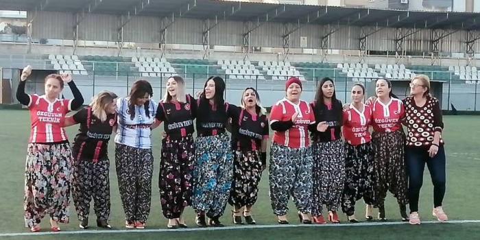 Aydın’da bir araya gelen çeşitli meslek gruplarından kadınlar, Adnan Menderes Stadyumu’nda "Kadına Yönelik Şiddet Utançtır" sloganıyla futbol turnuvası gerçekleştirdi. 10’ar kişilik 4 takımın katıldığı müsabakaya kadınlar, şalvar ve topuklu ayakkabılarıyla sahaya çıktı.