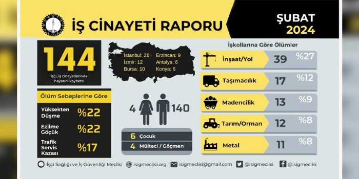 - İşçi Sağlığı ve İş Güvenliği Meclisi, Şubat’ta 6’sı çoçuk en az 144 işçinin, iş cinayetleri kurban verildiğini bildirdi.