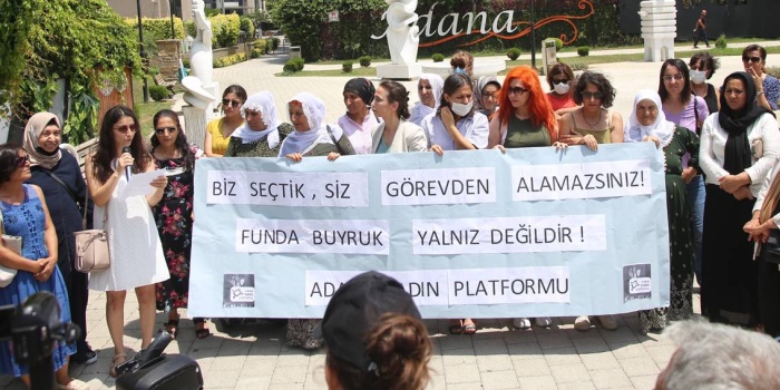 Adana Kadın Platformu, Seyhan Belediyesi Başkan Yardımcısı Funda Buyruk'un görevden uzaklaştırılmasına ilişkin Heykelli Park'ta açıklama yaptı. Açıklamaya HDP Adana Milletvekili Tülay Hatimoğulları, Adana İl Eşbaşkanı Helin Kaya, Kadın Meclisi, Özgür Kadın Hareketi (TJA) ve çok sayıda kadın katıldı. Basın metnini okuyan avukat Ayşe Zilan, “göle maya çalma” hikayesiyle karşı karşıya olduklarını ifade ederek, “Bu ilk değildi, son olmayacağını da yine ‘basın kuruluşu’ diyemeyeceğiz kuruluşların bildirdiği üzere, Seyhan Belediye Başkan Yardımcısı Funda Buyruk’un İçişleri Bakanlığı kararıyla görevden alındığı haberiyle gördük. Onların kökeninde göle çaldıkları zulüm mayası varsa, bizlerin de binlerce yıllık zulme direnme bilinci vardır, bilesiniz" dedi. Buyruk'un avukat olduğu bilinmesine rağmen avukat olmadan evi ve ofisinin arandığını aktaran Zilan, "Elbette bu durum düşman ceza hukukunun bir parçasıdır. İhlal edilen tek hak masuniyet karinesi olmadığı gibi, yaşam da ancak bahşettikleri bir haktır. Gün aşırı hedef alınan tüm bu kimlikleri taşımanın, layıkıyla yerine getirmenin bedeli ne olursa olsun bu mücadeleden vazgeçmeyecek, her türlü saldırıya karşı Funda’nın yanında durmaya devam edeceğiz" şeklinde konuştu.