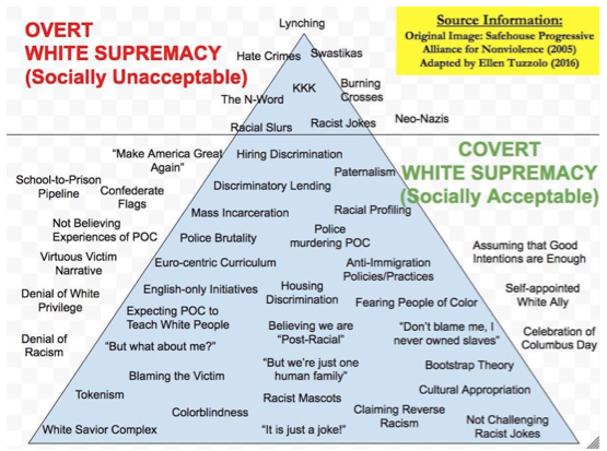 Tablo iki kısma ayrılıyor; örtük beyaz ırk üstünlüğü toplumsal alanda kabul görüyor şeklinde tanıtılıyor; yani toplum burada yazılan olgulara ve eylemlere karşı çıkmıyor. Örneklersek; ırkçı sembollere karşı çıkılmıyor. Siyahlara yapılan ırkçılık karşısında asıl siyahların ırkçılık yaptığı söylenirse, bu kabul görüyor. Keza siyahlara uygulanan polis şiddeti ve hatta siyahların renginden ötürü polis tarafından öldürülmesi toplumda tepkiye yol açmıyor. Bunlar da ‘hepimiz bir insanlık aileyiz’ gibi şatafatlı sözler ile örtülüyor. Irkçı şakalar ‘sadece şakaydı ya’ gibi anlamsız söylemlerle geçiştiriliyor. Irkçılık yapıldığında kurbanda suç aranıyor; ‘o da kesin şunu ya da bunu yapmıştır’ gibi seviyesiz ifadelerle suçu aklamaya giden bir söylemi ifade ediyor. Bir yerlerden tanıdık geliyordur tüm bunlar. Hepsini bir şekilde Türkiye’de Kürtlere (ve diğer ulus, halk ve topluluklara) yapılan ırkçılıklarda da görmek mümkün.