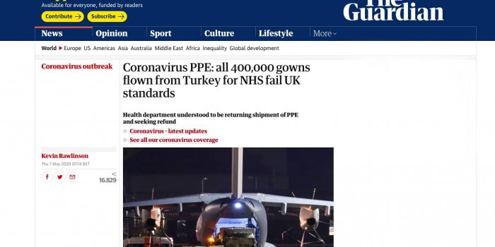 The Guardian’ın 7 Mayıs tarihli haberine göre ise İngiliz Sağlık Bakanlığı Ulusal Sağlık Sistemi’nin ihtiyacı için Türkiye’den getirilen koruyucu kıyafetlerin İngiliz sağlık sistemi standartlarına uymadığını doğrulamıştı.