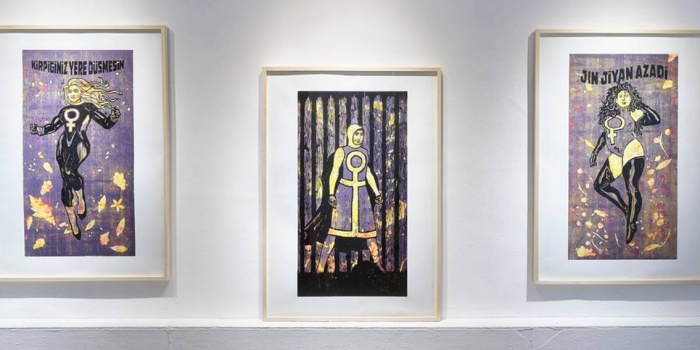 Türkiye ve Kuzey Kürdistan’da feminist hareketin sloganlarından bir tanesi de “erkek adalet değil gerçek adalet istiyoruz”. Tam da bu noktadan başlayarak serginin konusuna doğrudan yanıt veren bir iş koyuyor Rüzgâr Buşki ve panelde de bu sloganı vurguluyor. Söz konusu kadınlar olduğunda suç nedir, hak ve hukuk nedir neye göre tanımlanıyor? “Ne seninim, ne kara toprağın” başlıklı bu çalışma, yaşamı savunan, yaşamı ve kendini seçen 3 kadının, Çilem Doğan, Nevin Yıldırım ve Yasemin Çakal’ın tahta blok üzerine baskı yöntemi ile üretilmiş portreleri ile odayı dolduruyor. Süper kahraman kavramı üzerine düşünen sanatçı bu kadınları kendisini kötü hissettiğinde elinden tutan, düştüğü yerden kaldıran ve hayatına devam etmek için ona güç veren süper kahramanları olarak hayal ediyor.