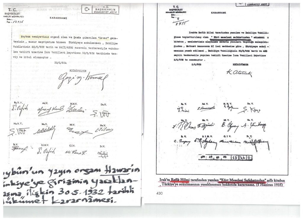 Yüksel, daha sonra ilk kez yayımladığımız Şark Islahat Planı’nın Kürt yayıncılığı ve kültürü üzerindeki trajik sonuçlarını irdeliyor ve XOYBÛN yayınları üzerindeki yoğun baskı ve yasaklara dikkat çekiyor. XOYBÛN’un 1932’den itibaren Kürtçe ve Fransızca olarak çıkardığı “Hawar”, “Ronahi”, “Roja Nû” ve “Stêr” dergilerinden başlayarak “Hawar Kütüphanesi” dizisinde Dr. Celadet Bedirxan yönetiminde yayımlanan ve Ankara Hükümeti’nce yasaklanan yayınlar şöyle sıralanıyor: