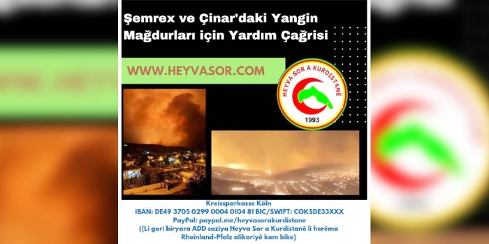 Amed’in Xana Axpar (Çınar) ve Mardin’in Şemrex (Mazıdağı) ilçelerine bağlı kırsal mahallelerde 20 Haziran’daki çıkan yangında 15 yurttaş yaşamını yitirdi, onlarca kişi yaralandı. Binlerce dekar arazi küle dönerken, yaklaşık bin hayvan da yangınlarda öldü. Hayatını kaybedenlerin ailelerine başsağlığı, yaralılara acil şifalar dileyen Heyva Sor a Kurdistanê, “Daha önceki tüm felaketlerde olduğu gibi hemen vatandaşların yaralarını sarmak için harakete geçtik. Yangın mağdurları için maddi yardım toplayarak, mağdurların ihtiyaçlarını en kısa sürede karşılayacağız. Avrupa'daki Kurdistanlıları ve dostlarını, Heyva Sor a Kurdistanê aracılığıyla mağdur ailelere yardım eli uzatmaya çağırıyoruz” dedi. HABER MERKEZİ