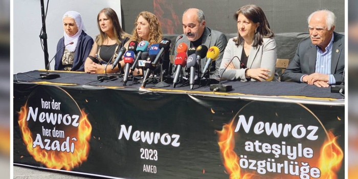 Deprem bölgesinde yükselen ve 8 Mart etkinliklerine de yansıyan iktidara karşı öfke, Newroz meydanlarına taşınacak. Newroz meydanları, aynı zamanda seçim gündeminin de startı olacak. Demokratik Toplum Kongresi (DTK), Özgür Kadın Hareketi (TJA), Demokratik Bölgeler Partisi (DBP), Halkların Demokratik Partisi (HDP) öncülüğünde, Birleşik Kadın Platformu, İnsan ve Özgürlük Partisi (PÎA), Kürdistan Demokrat Partisi-Türkiye (KDP-T), Azadi Partisi ve Kürdistan Komünist Partisi’nin (KKP) imza attığı deklarasyon, dün Amed’in Sur ilçesindeki Dicle Fırat Kültür ve Sanat Merkezi’nde açıklandı. Toplantıya, DTK Eşbaşkanı Berdan Öztürk, DBP Eşbaşkanı Saliha Aydeniz, HDP Eşbaşkanı Pervin Buldan, PÎA Genel Başkanı Mehmet Kamaç, KKP Genel Başkanı Sinan Çiftyürek, KDP-T Genel Başkanı Mehmet Emin Gardaş, Kürdistan Sosyalist Partisi (PSK) Meclis Üyesi Ali Haydar ve Azadî Hareketi'nden Cemal Satı katıldı.