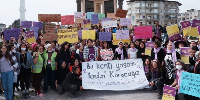 Hatay Afet Kadınlar Birlikte Güçlü’nün çağrısı ile çeşitli noktalardan yürüyüş yaparak meydanda gerçekleştirilen eylemde Türkçe, Kürtçe ve Arapça “Kadın Yaşam Özgürlük” “Hatay’ı yeniden kadınlar kuracak” sloganları atan kadınlar, dayanışma çağrısı yaparak, depremde hayatını kaybedenlerin hesabını sormak için kadınlara birlik olma çağrısı yaptı. Kadın cinayetlerinde ve depremde hayatını kaybeden kadınların anıldığı eylemde depremde yaşanan ölümlerde sorumluluğu olanlardan hesap sorulması istendi.