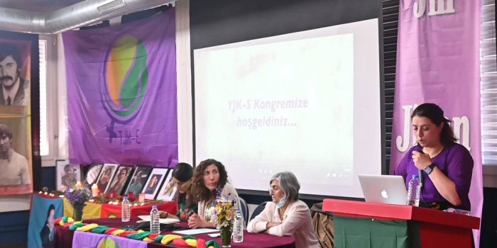 Kürt Halk Önderi Abdullah Öcalan’ın kadın özgürlüğü üzerine değerlendirmelerinin bir sunumla aktarıldığı kongrede Avrupa Kürt Kadın Hareketi (TJK-E) adına Zozan Derik bir konuşma yaptı.