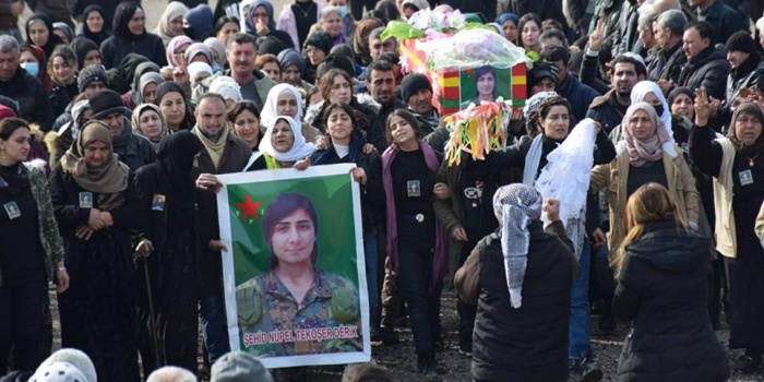 YPJ savaşçısı Nûpel Têkoşer Dêrik’in (Sena Elî) cenazesini Dêrik’teki Şehit Hogir Hastanesi’nden alan yüzlerce kişi Şehit Xebat Dêrik Şehitliği’nde cenaze töreni yaptı. Törende kısa bir konuşma yapan Derik Şehit Aileleri Meclisi üyesi Ciwan Elî, Kürdistan’daki kadın direnişine dikkat çekti. Ardından konuşan YPJ savaşçısı Rojbîn Gelhat, “Nûpel, halkının özgürlüğü için mücadele eden bir direniş timsaliydi” diyerek Nûpel Têkoşer’i yaşamına değindi. Konuşmaların ardından Şehit Nûpel Têkoşer’in şehadet belgesi okunarak ailesine teslim edildi.