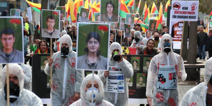 Almanya’nın Darmstadt, Köln, Bielefeld, Stuttgart, Münih, Freiburg, Kassel ve Hamburg kentlerinde alanlara çıkan Kürtler ile dostları, beyaz tulumlar giydi ve kimyasalla katledilen 17 gerillanın fotoğraflarını taşıdı.