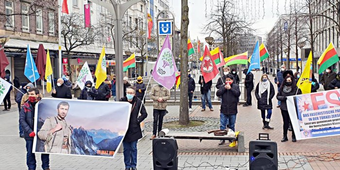 Kürtler ve Alman enternasyonalistlerin katılımı ile düzenlenen eylemde KON-MED’in açıklaması okundu. Abdullah Öcalan özgürlüğüne kavuşana kadar mücadelenin devam edeceği de dile geldi.